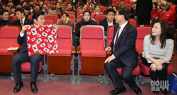 29일, 서울 여의도 국회 의원회관 대강당에서 열린 노동개혁 연내 입법 호소 헌혈대회 도중 새누리당 원유철 원내대표가 태극기손수건을 펼쳐보이며 이기권 고용노동부장관이 이야기를 나누고 있다.