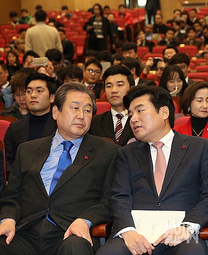 29일, 서울 여의도 국회 의원회관 대강당에서 열린 노동개혁 연내 입법 호소 헌혈대회 도중 새누리당 김무성 대표(사진 왼쪽)와 원유철 원내대표가 귓속말을 나누고 있다.