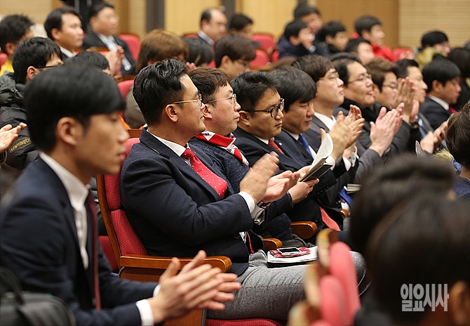 29일, 서울 여의도 국회 의원회관 대강당에서 열린 노동개혁 연내 입법을 호소하는 헌혈대회에 참석한 청년위원회 등 참석자들이 박수를 치고 있다.