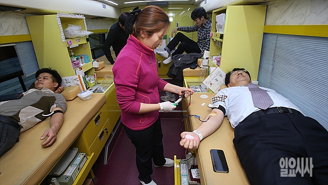 29일, 서울 여의도 국회서 새누리당 권성동 의원(사진 오른쪽) 등이 당 청년위원회와 청년단체가 함께 연 '노동개혁 연내 입법 호소 헌혈대회' 후 헌혈버스에 올라 채혈을 받고 있다.