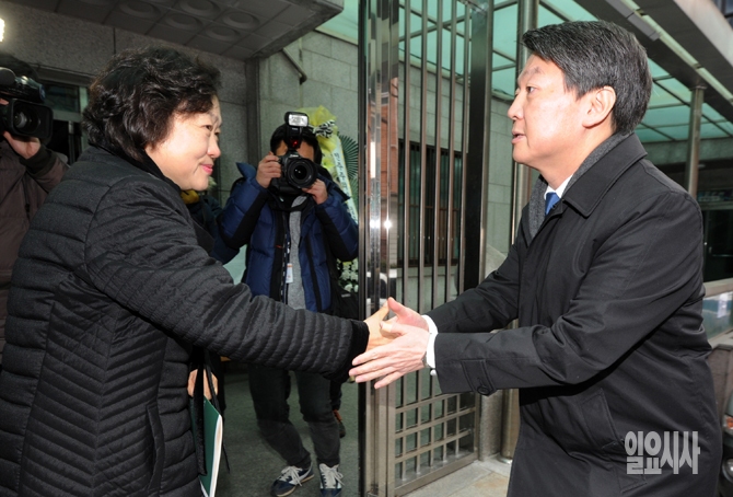 무소속 안철수 의원이 30일 오전 서울 도봉구 창동성당에서 열린 고 김근태 전 의장 4주기 추도미사에서 참석하며 고 김근태 전 의장의 부인인 인재근 의원과 인사를 하고 있다.