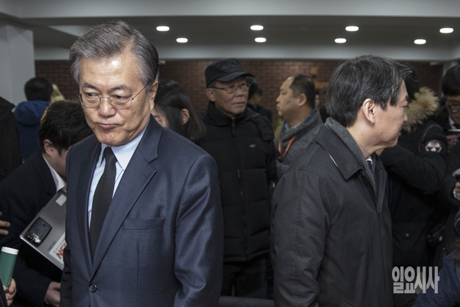 문재인 더불어민주당 대표와 안철수 무소속 의원이 30일 오전 서울 도봉구 창동성당에서 열린 고 김근태 전 상임고문의 4주기 추모행사에서 만나 대화를 나눈 뒤 뒤돌아서고 있다.