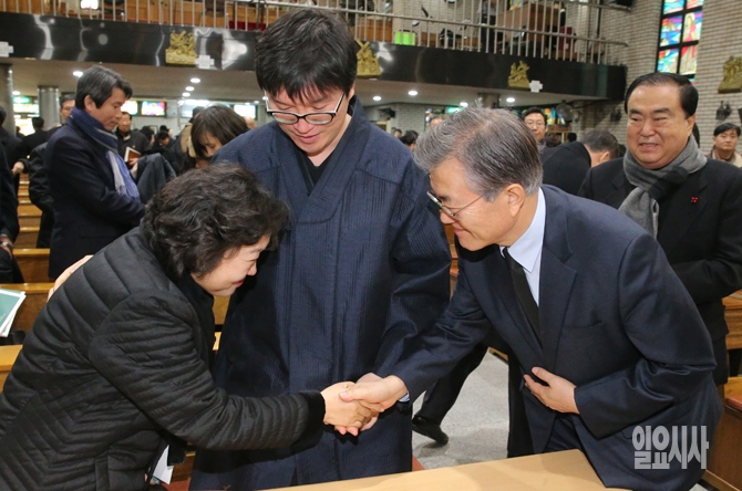 30일 서울 도봉구 창동 성당에서 열린 고(故) 김근태 전 상임고문의 4주기 추모행사에서 더불어민주당 문재인 대표와 무소속 안철수 의원이 악수를 나누고 있다.