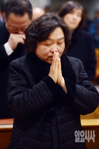 30일 오전 서울 도봉구 창동성당에서 열린 민주주의자 고 김근태 선생 4주기 추모미사에서 더불어민주당 인재근 의원이 두손을 모으고 기도하고 있다.