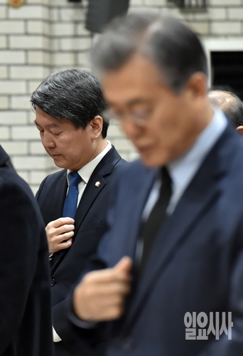 30일 오전 서울 도봉구 창동성당에서 열린 민주주의자 고 김근태 선생 4주기 추모미사에서 더불어민주당 문재인 대표와 무소속 안철수 의원이 성호를 긋고 있다.