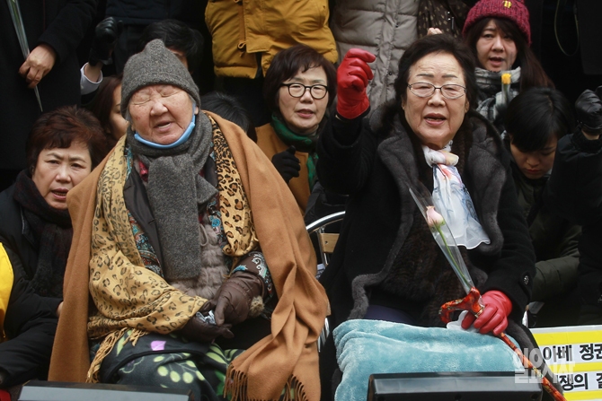 30일 오후 서울 종로구 일본대사관 앞에서 열린 '1211차 수요집회'에서 길원옥, 이용수 할머니가 일본 정부의 공식 사죄를 촉구하며 구호를 외치고 있다.