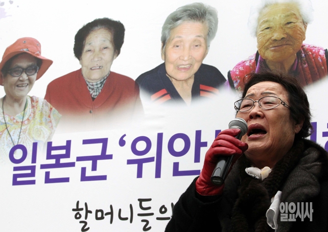 30일 오후 서울 종로구 일본대사관 앞에서 열린 '1211차 수요집회'에서 이용수 할머니가 일본 정부의 공식 사죄를 촉구하는 발언을 하고 있다.