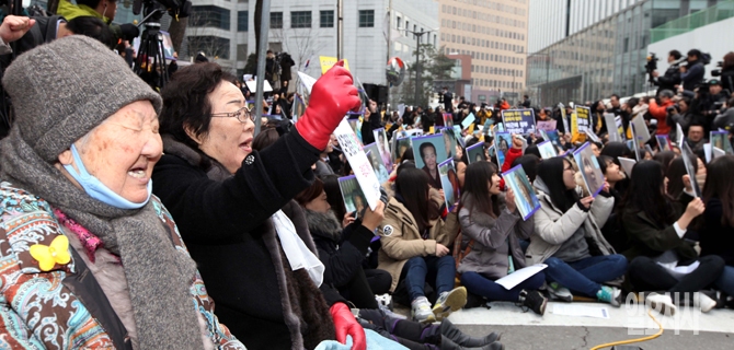 30일 오후 서울 종로구 일본대사관 앞에서 열린 '1211차 수요집회'에서 길원옥, 이용수 할머니를 비롯한 참가자들이 일본 정부의 공식 사죄를 촉구하며 구호를 외치고 있다.