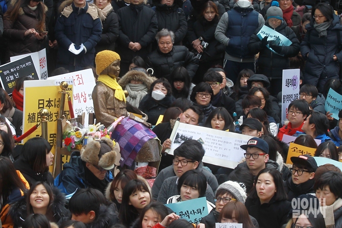30일 오후 서울 종로구 일본대사관 앞에서 열린 '1211차 수요집회'에서 일본군 위안부 피해자의 상징인 소녀상 주변을 집회 참가자들이 가득 메우고 있다.