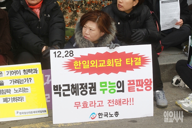 30일 오후 서울 종로구 일본대사관 앞에서 열린 '1211차 수요집회'에서 집회에 참가한 한국노총 관계자가 박근혜 정부의 한일외교회담 결과를 규탄하는 피켓을 들고 있다.
