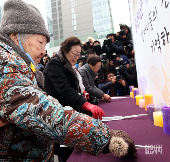 30일 오후 서울 종로구 일본대사관 앞에서 열린 '1211차 수요집회'에서 길원옥, 이용수 할머니를 비롯한 참가자들이 돌아가신 할머니들을 추모하고있다.