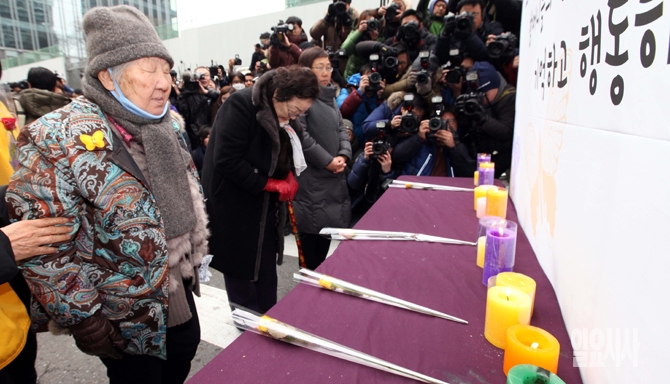 30일 오후 서울 종로구 일본대사관 앞에서 열린 '1211차 수요집회'에서 길원옥, 이용수 할머니를 비롯한 참가자들이 돌아가신 할머니들을 추모하고있다.