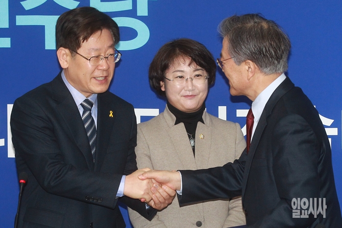 문재인 더불어민주당 대표가 30일 오전 서울 여의도 국회에서 더불어민주당 최고위원회의 시작 전 열린 박근혜 정부 복지정책 공동거부선언에서 이재명 성남시장과 악수를 하고 있다.