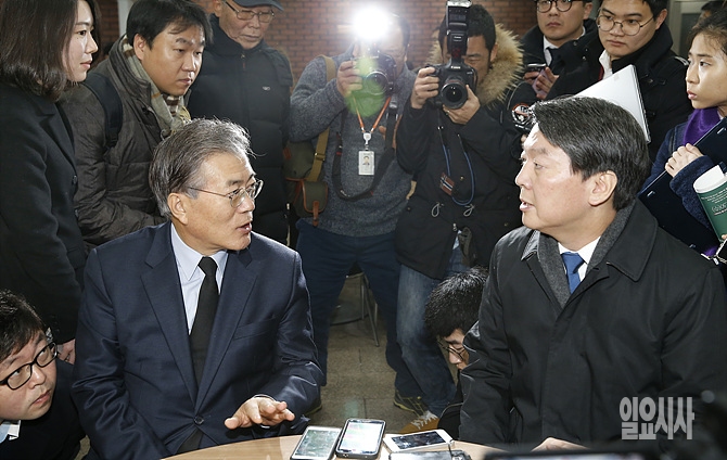 30일, 더불어민주당 문재인 대표(사진 왼쪽)가 서울 도봉구 창동성당서 열린 고 김근태 선생 4주기 추모미사에 참석한 무소속 안철수 의원과 대화를 나누고 있다.