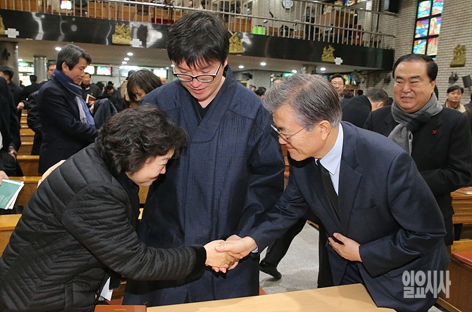 30일, 더불어민주당 문재인 대표(사진 오른쪽)가 서울 도봉구 창동성당서 열린 고 김근태 선생 4주기 추모미사에 참석한 인재근 의원과 악수를 나누고 있다.