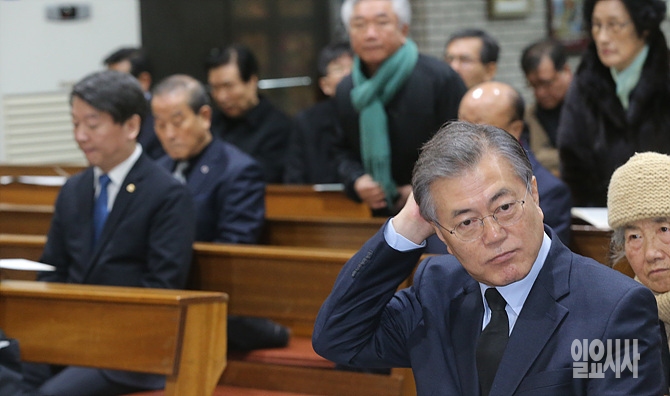 30일, 더불어민주당 문재인 대표가 서울 도봉구 창동성당서 열린 고 김근태 선생 4주기 추모미사에 참석해 잠시 머쓱한 표정을 뒷머리를 만지고 있다.