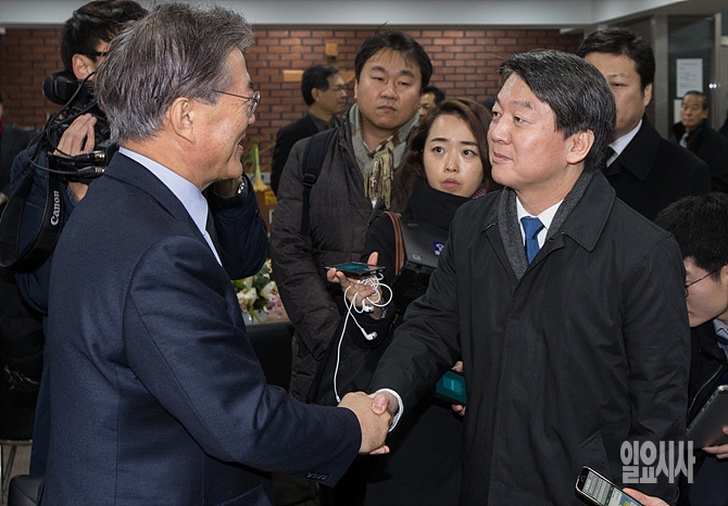 30일, 더불어민주당 문재인 대표(사진 왼쪽)가 서울 도봉구 창동성당서 열린 고 김근태 선생 4주기 추모미사에 참석한 무소속 안철수 의원과 악수를 나누고 있다.