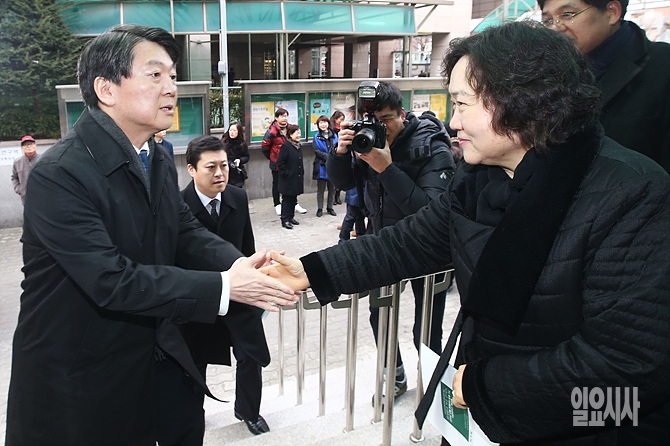 30일, 무소속 안철수 의원(사진 왼쪽)이 서울 도봉구 창동성당서 열린 고 김근태 선생 4주기 추모미사에 참석한 더불어민주당 인재근 의원과 악수를 나누고 있다.