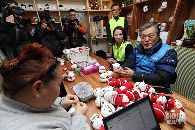 30일, 더불어민주당 문재인 대표가 서울 용산구 동자동 쪽방촌을 찾아 주거취약 계층 지원을 위해 현장을 방문한 가운데, 한 주거민과 이야기를 나누고 있다.