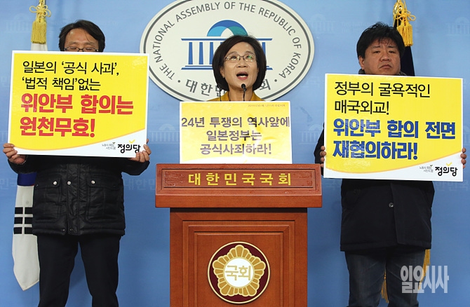 30일, 서울 여의도 국회 정론관에서 정의당 김제남 의원이 정부의 일본군 위안부 합의와 관련해 "일본 정부는 공식사죄하라"며 기자회견을 갖고 있다.