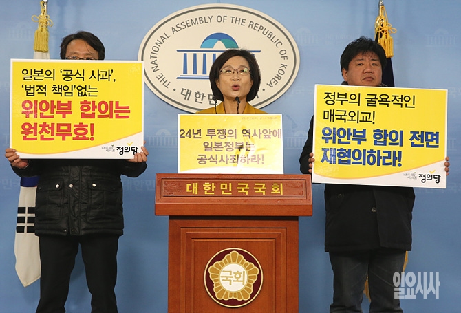 30일, 서울 여의도 국회 정론관에서 정의당 김제남 의원이 정부의 일본군 위안부 합의와 관련해 기자회견을 갖고 있다.