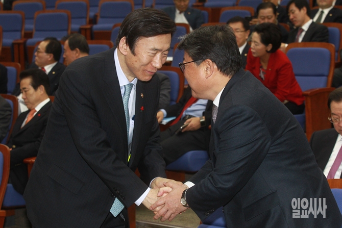 윤병세 외교부 장관과 조원진 새누리당 원내수석부대표가 31일 오전 서울 여의도 국회에서 열린 새누리당 의원총회에서 악수를 하고 있다.