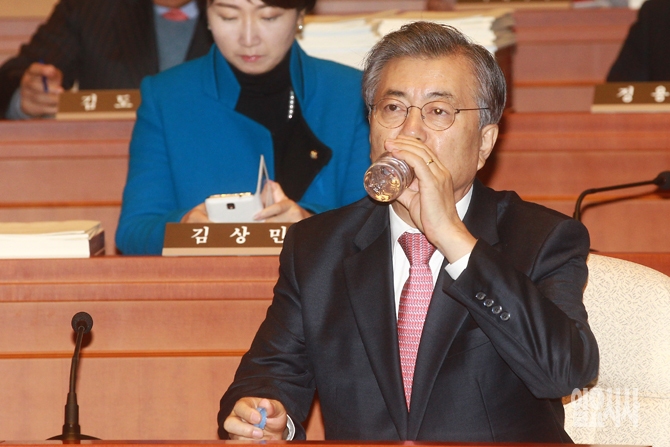 문재인 더불어민주당 대표가 31일 오전 서울 여의도 국회에서 열린 더불어민주당 의원총회에서 물을 마시고 있다.