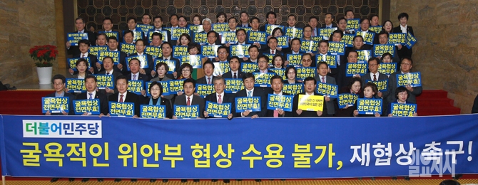 더불어민주당 소속 의원들이 31일 오전 서울 여의도 국회에서 박근혜 정부의 일본군 위안부 문제 한일외교회담 결과에 대한 규탄대회를 갖고 있다.