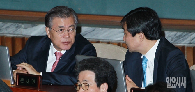 더불어민주당 문재인 대표와 이종걸 원내대표가 31일 오전 서울 여의도 국회에서 열린 국회 본회의에서 대화를 나누고 있다.