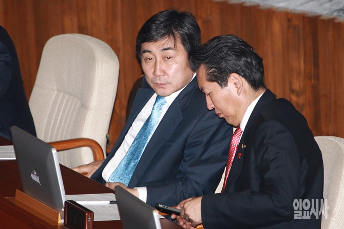 더불어민주당 이종걸 원내대표와 정청래 최고위원이 31일 오전 서울 여의도 국회에서 열린 국회 본회의에서 대화를 나누고 있다.