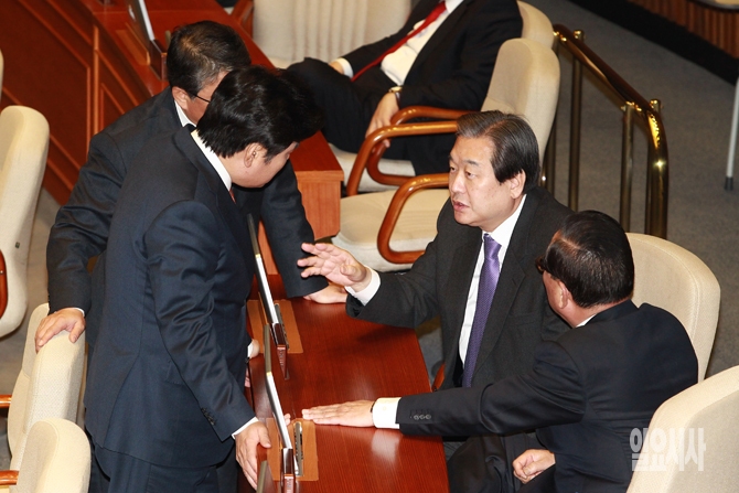 새누리당 김무성 대표, 원유철 원내대표, 서청원 최고위원, 조원진 원내수석부대표가 31일 오전 서울 여의도 국회에서 열린 국회 본회의에서 논의를 하고 있다.