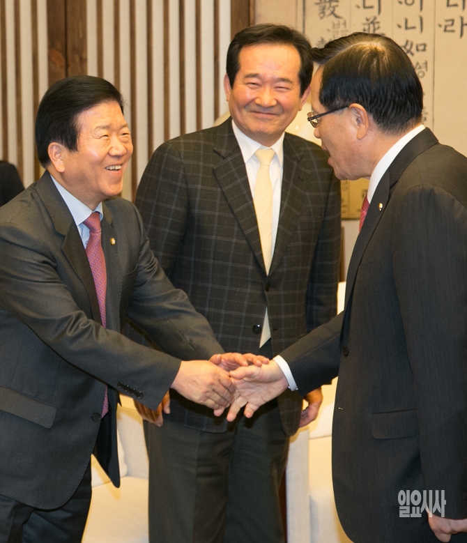 31일 오후 서울 여의도 국회 의장접견실에서 정의화 국회의장 주재로 열린 여야 중진 의원 회동에 참석한 정 의장과 의원들이 인사하고 있다. 오른쪽부터 정 의장, 정세균, 박병석 더불어민주당 의원.