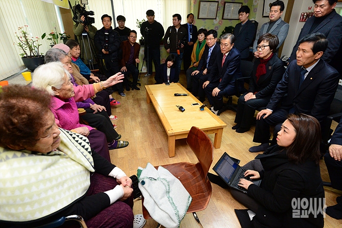 31일, 더불어민주당 문재인 대표 등 지도부가 경기도 광주 소재의 '나눔의 집'을 찾은 가운데, 위안부 할머니들의 발언을 경청하고 있다.