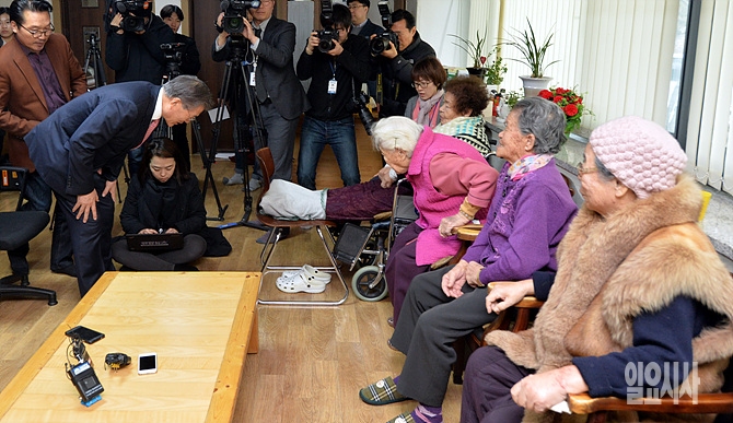 31일, 더불어민주당 문재인 대표가 경기도 광주 소재의 '나눔의 집'을 찾아 위안부 할머니들에게 인사를 하고 있다.