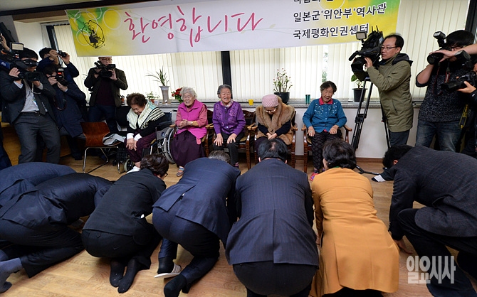 31일, 더불어민주당 문재인 대표 및 지도부가 경기도 광주 소재의 '나눔의 집'을 찾아 위안부 할머니들에게 큰절을 올리고 있다.