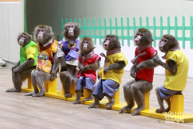 경기도 고양 국제 꽃박람회 전시관에서 전북 부안 원숭이학교 소속 원숭이들이 한복을 곱게 차려 입은채 자리에 앉아 있다.