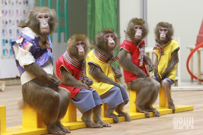 경기도 고양 국제 꽃박람회 전시관에서 전북 부안 원숭이학교 소속 원숭이들이 한복을 곱게 차려 입은채 자리에 앉아 있다.