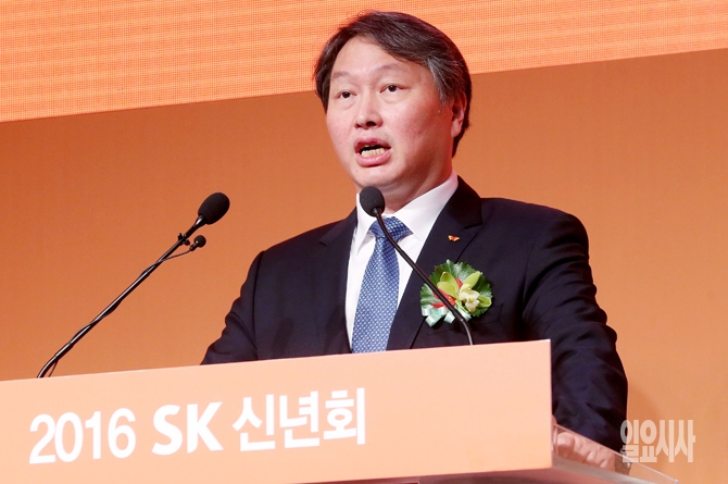 최태원 SK그룹 회장이 ‘혼외자’ 공개 파문 이후 처음 공식석상에 참석한 4일 오전 서울 광장동 워커힐호텔에서 열린 그룹 신년 하례식에서 인사말을 하고 있다.