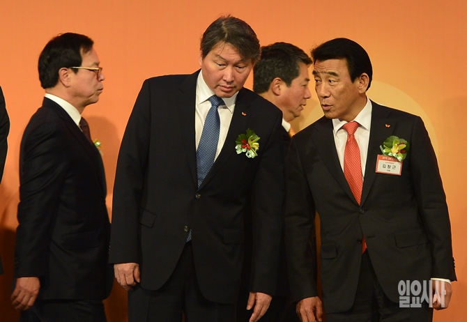 최태원 SK그룹 회장이 ‘혼외자’ 공개 파문 이후 처음 공식석상에 참석한 4일 오전 서울 광장동 워커힐호텔에서 열린 그룹 신년 하례식에서 김창근 SK수펙스추구협의회 의장과 귀엣말을 나누고 있다.