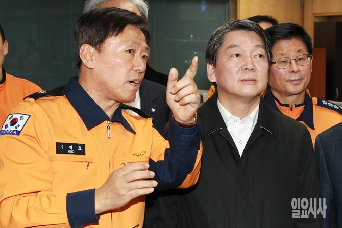 신당 창당을 준비중인 무소속 안철수 의원이 4일 오후 서울 중구 서울종합방재센터 종합상황실을 방문해 시설과 장비 등을 둘러보며 근무자에게 설명을 듣고 있다.