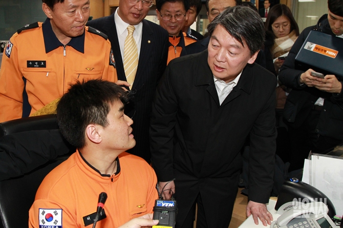 신당 창당을 준비중인 무소속 안철수 의원이 4일 오후 서울 중구 서울종합방재센터 종합상황실을 방문해 시설과 장비 등을 둘러보며 근무자와 대화를 나누고 있다.