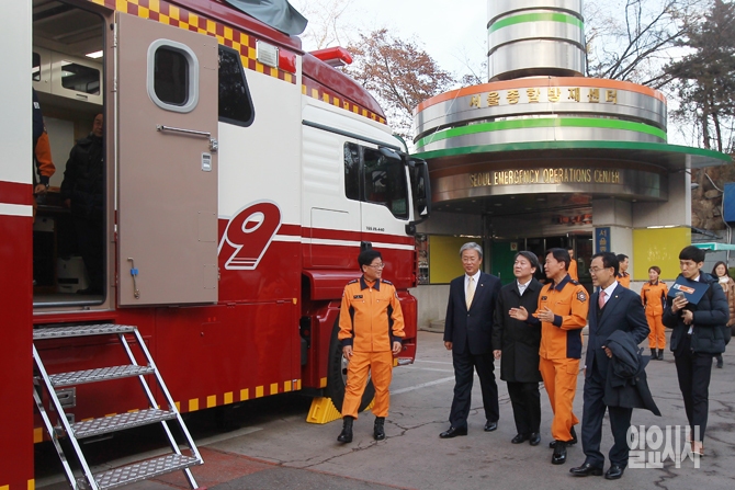 신당 창당을 준비중인 무소속 안철수 의원이 더불어민주당을 탈당한 무소속 유성엽, 임내현 의원과 함께 4일 오후 서울 중구 서울종합방재센터를 방문해 서울시긴급구조통제단지휘차량에 대해 설명을 듣고 있다.