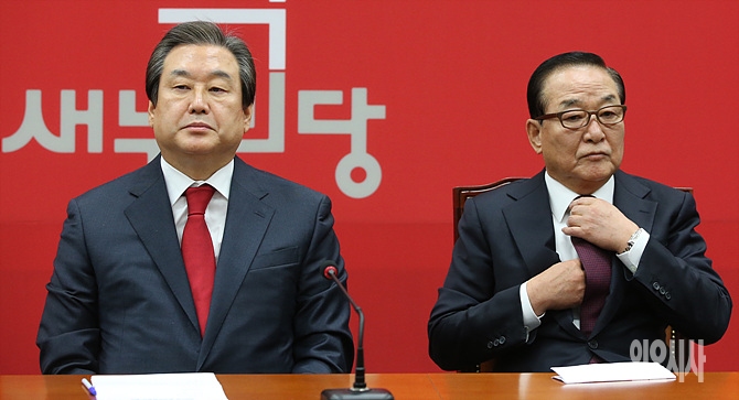 4일, 서울 여의도 국회서 열린 새해 첫 새누리당 최고위원회의서 김무성 대표(사진 왼쪽)와 서청원 최고위원이 싸늘한 표정을 하고 있다.