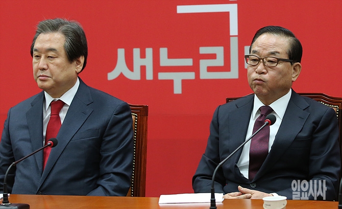 4일, 서울 여의도 국회서 열린 새해 첫 새누리당 최고위원회의가 열린 가운데, 김무성 대표(사진 왼쪽)와 서청원 최고위원이 불편한 표정을 짓고 있다.