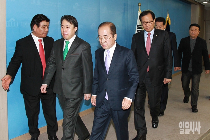 전 충남도당 당직자 등이 5일 오전 서울 여의도 국회에서 가진 더불어민주당 탈당 기자회견 후 기자회견장을 나서고 있다.