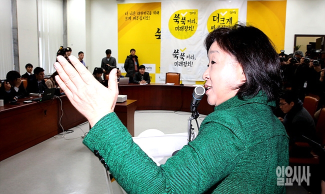 5일, 서울 여의도 국회서 정의당 심상정 대표가 국민공포캠페인 정의당 CI에 대해 설명을 하고 있다.