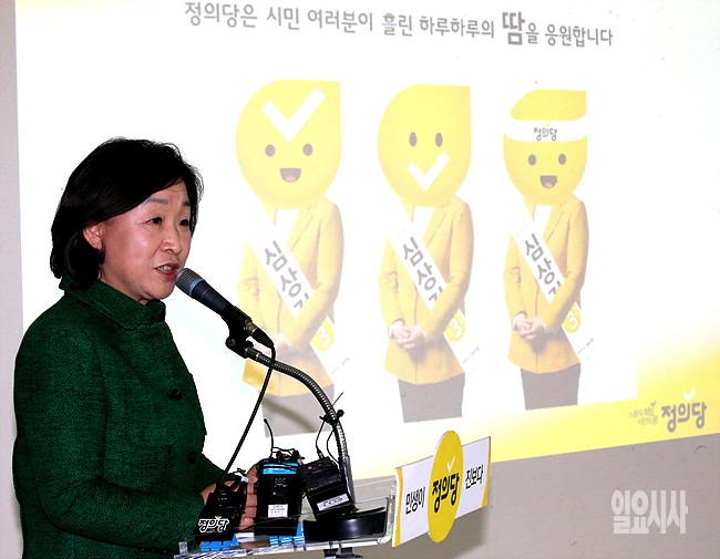 5일, 서울 여의도 국회서 정의당 심상정 대표가 총선캠페인 CI에 대해 설명을 하고 있다.
