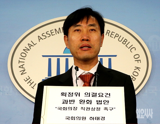 5일, 새누리당 하태경 의원이 선거구 획정 의결요건 과반 완화 법안을 국회의장 직권상정으로 본회의 상정을 촉구하는 기자회견을 갖고 있다.