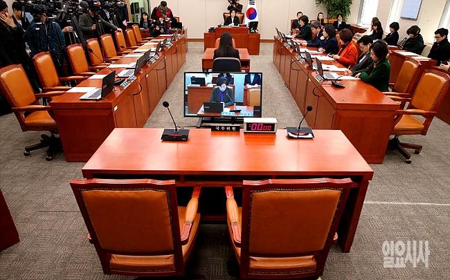 5일, 서울 여의도 국회 여성가족위원회 회의실서 열린 '한일 외교장관회담의 일본군위안부 문제 협상 현안보고'를 안건으로 한 여가위 전체회의에서 여당 여가위 위원들과 국무위원(여가부장관)이 불참한 채 야당 단독으로 회의가 열리고 있다.