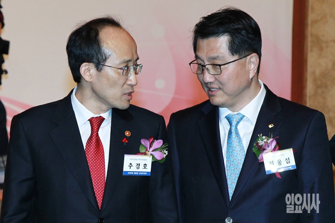 추경호 국무조정실장(왼쪽)과 진웅섭 금융감독원장이 5일 오후 서울 소공동 롯데호텔에서 열린 2016년 범금융 신년인사회에서 대화를 나누고 있다.